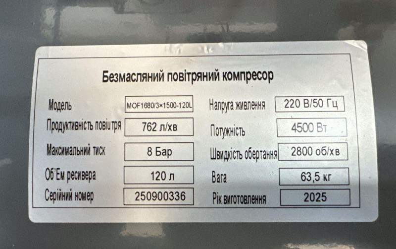 Основные характеристики Безмасляний поршневий компресор Mast MOF1680/3x1500-120L