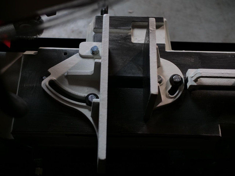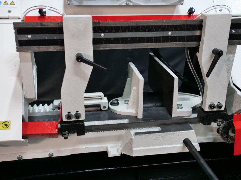 Опускание режущей головы осуществляется под действием силы тяжести и ограничивается гидроцилиндром, что делает ее движение плавным и контролируемым. Также режущую голову можно зафиксировать на любой высоте, чтобы начало опускания производилось непосредственно над заготовкой. Угол резки регулируется с помощью поворотных тисков. Благодаря эффективной системе охлаждения СОЖ, этот станок ленточный по металлу может работать на высоких скоростях без риска перегрева, что позволяет добиться высокой производительности.