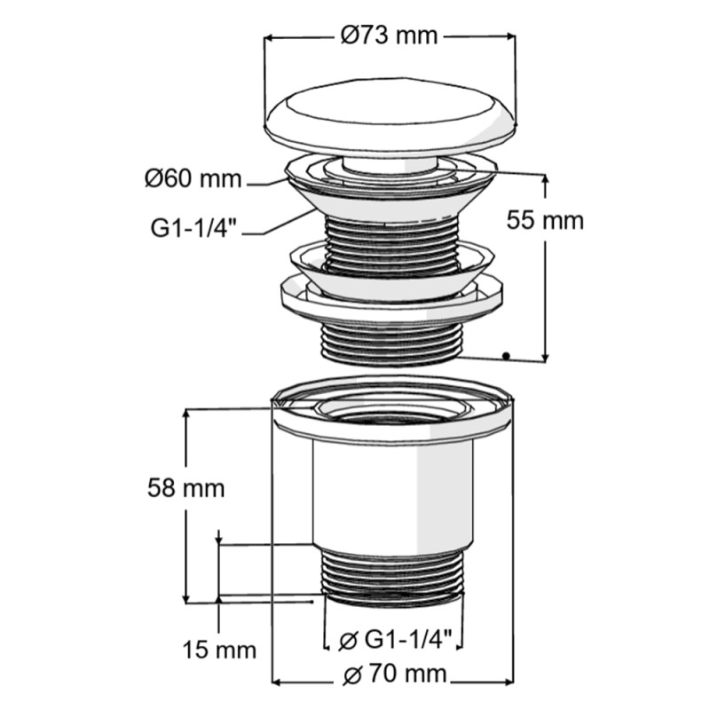 Донный клапан ELIXIR для раковины без перелива с выходом 1-1/4" и инновационной системой нажатия CLICK-CLACK. Этот изысканный аксессуар сочетает в себе высокое качество материалов, стильный дизайн и удобство использования, делая вашу ванную комнату еще более функциональной и привлекательной.
