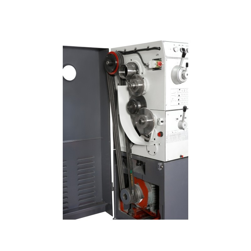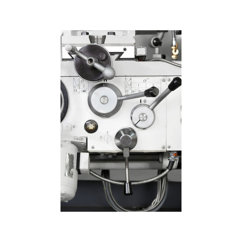 Шпиндель установлен на прецизионных подшипниках и имеет зажим Camlock (D1-8). Асинхронный двигатель мощностью 5,5 кВт и механическая ступенчатая коробка передач с рычажным переключением обеспечивают стабильные обороты без проседаний и высокий крутящий момент на низких скоростях. Универсальная коробка подач позволяет нарезать резьбу без смены шестерен. Массивная конструкция, централизованные точки смазки и встроенная система СОЖ делают этот универсальный токарный станок для цеха точным, надежным и безотказным.