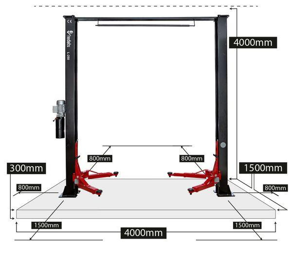 Особенности полуавтоматического двухколонного подъемника REDATS L-250 Верхняя синхронизация Ручная разблокировка предохранительных стопоров Общая высота – 3605 мм Мощность двигателя – 2,2 кВт Напряжение питания – 400 В Грузоподъемность – 4 тонны Диапазон подъема – 110-1800 мм Время подъема – около 50 с Максимальная ширина автомобиля – 2576 мм Телескопические асимметричные лапы Размах передних лап – 705-1045 мм, задних лап – 828-1228 мм Резиновые защитные накладки Защитные кожухи тросов Конечный выключатель Предохранительный клапан Кнопка аварийной остановки Вес – 650 кг Толщина бетонной заливки – 30 см (класс бетона В25). Частые вопросыБольше о двухколонных автоподъемниках – в ответах на частые вопросы.