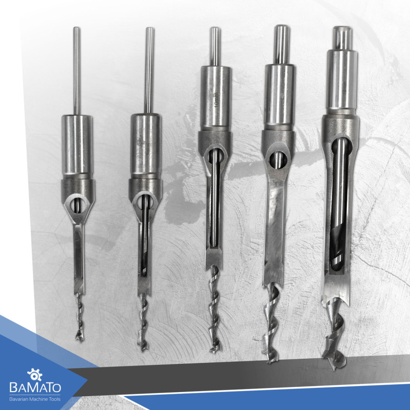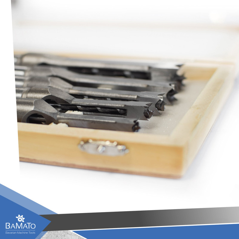 Набір свердел для отворів врізних BAMATO призначений для просвердлювання прямокутних отворів під шип. Для використання цих свердлів потрібен довбаний верстат, наприклад, BAMATO STM-120. Цей набір складається з 5 предметів, які упаковані у дерев'яну скриньку. Розміри свердл у наборі: 6, 8, 10, 12, 16 мм.