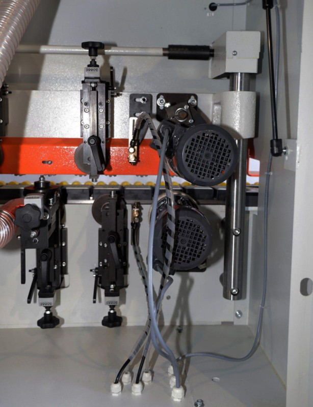 Мощность двигателей 0,55 кВт – фрезеровка кромки с припуском более 2 мм; Настройка узла производится с помощью счетчиков, что обеспечивает точность и простоту перенастройки; Круглые копиры большого диаметра Ø180 мм исключают повреждение любой облицованной поверхности.