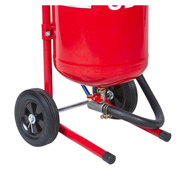 Аппарат выдерживает давление до 8,6 Бар и совместим с широким спектром абразивов. Для считывания текущего давления есть манометр. Объем бака 17 л оптимален для средних объемов работ с сохранением мобильности. Бак изготовлен из толстостенной стали с качественными сварными швами и герметичной горловиной. Колеса и ручка позволяют перемещать устройство, не поднимая его с земли. Такой пескоструй на колесах поставляется с комплектом сопел разных диаметров (2 мм; 2,5 мм; 3; 3,5 мм), что позволяет адаптироваться под тип абразива и поверхности и настроить интенсивность струи.