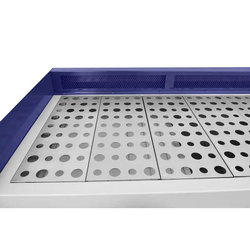 Радиальный вентилятор создает сильный вакуум и стабильный воздушный поток, а двойная система фильтрации обеспечивает высокую эффективность очистки. Многозонная вентиляция повышает эффективность пылеулавливания. Рабочая поверхность состоит из пяти отдельных сегментов, что обеспечивает легкий монтаж и удобный доступ к фильтрам. Жесткий корпус из металлических панелей делает этот вытяжной стол для шлифования долговечным и надежным в условиях интенсивной эксплуатации.